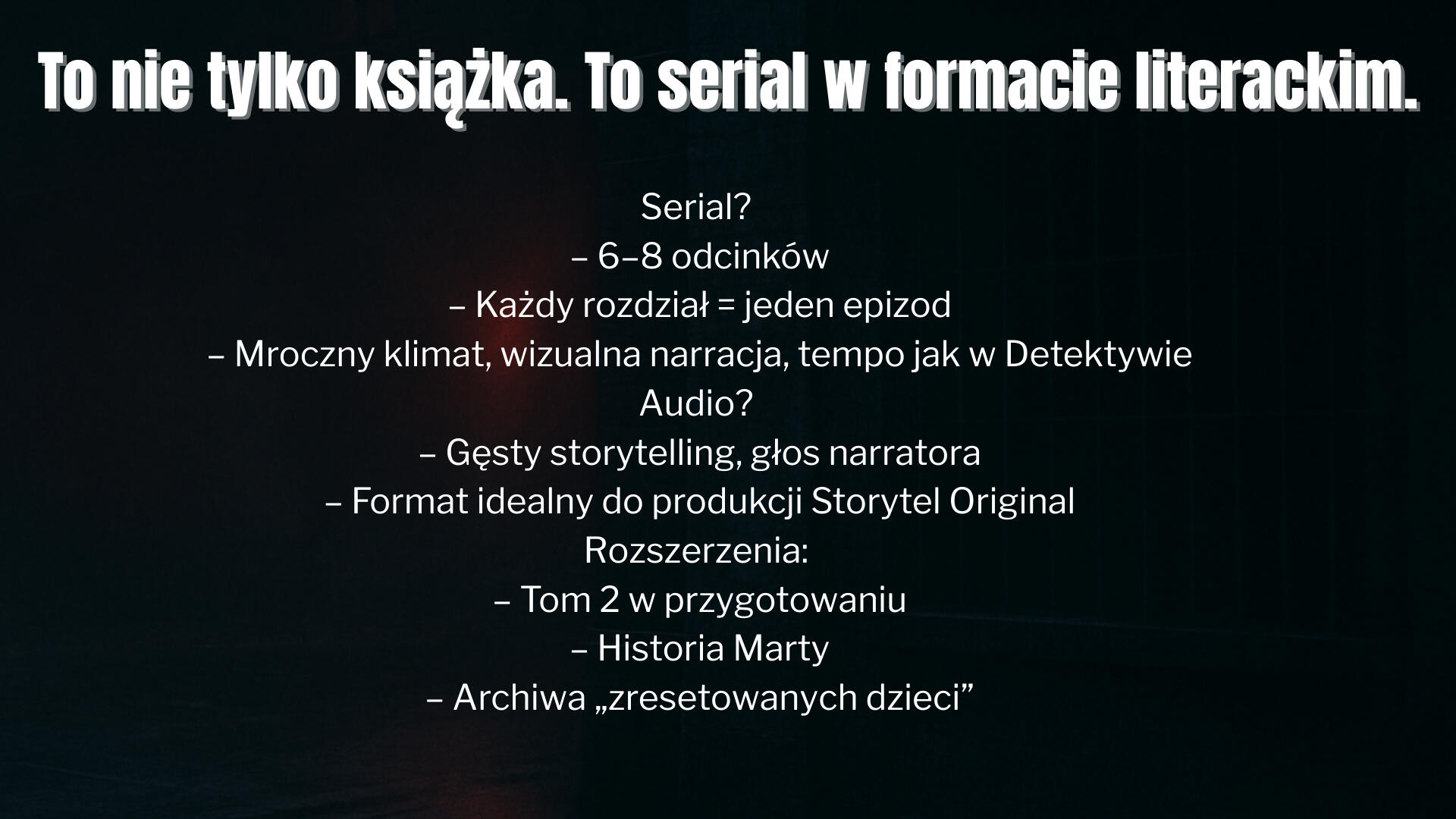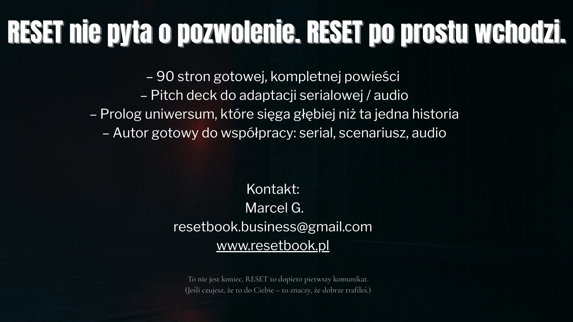 Marcel nie szuka prawdy – on tylko chce przestać czuć.Gdy znika Marta – dziewczyna, która nie powinna istnieć – zaczyna się odgrzebywanie przeszłości.RESET to historia o kasetach VHS, wymazanych dzieciach i systemie, który nie zapomina.