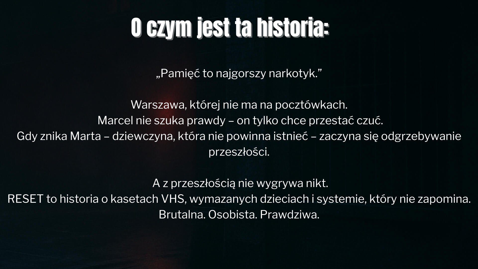 Marcel nie szuka prawdy – on tylko chce przestać czuć.Gdy znika Marta – dziewczyna, która nie powinna istnieć – zaczyna się odgrzebywanie przeszłości.RESET to historia o kasetach VHS, wymazanych dzieciach i systemie, który nie zapomina.
